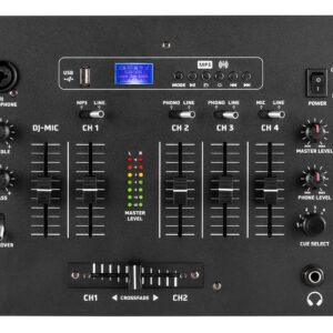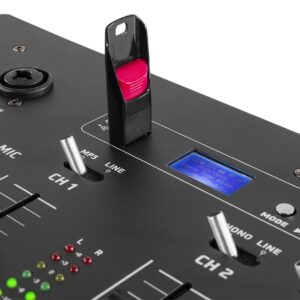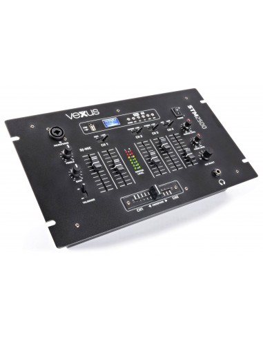 Mezclador de 5 canales para DJs con poca experiencia. Provisto de una entrada USB para reproducir directamente desde un stick USB. Ademas incorpora un receptor BT que permite reproducir en musica en streaming directamente desde un smartphone o cualquierr otro emisor BT